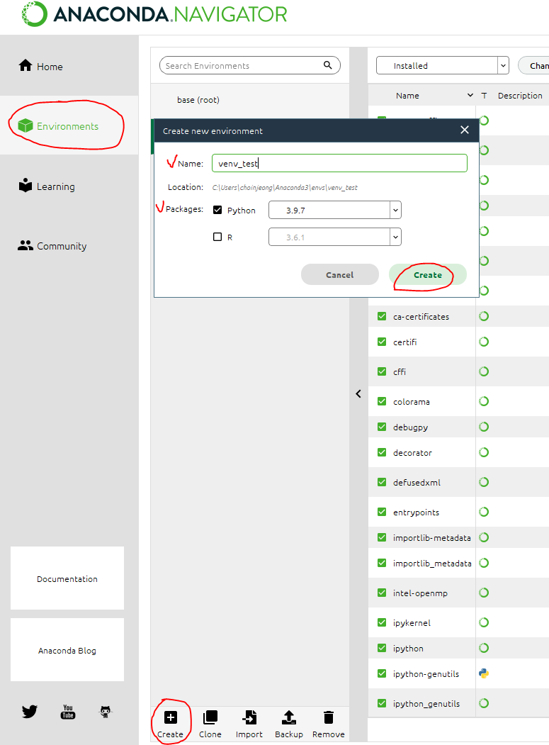 원하는 가상환경 이름과 파이썬 버전을 선택하여 생성하기
