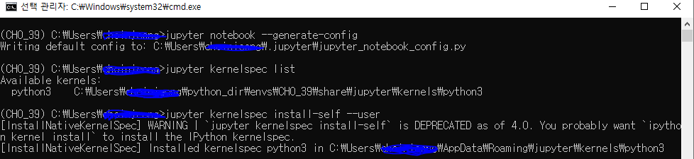 4. anaconda promprt로 돌아와 jupyter kernelspec install-self --user 입력