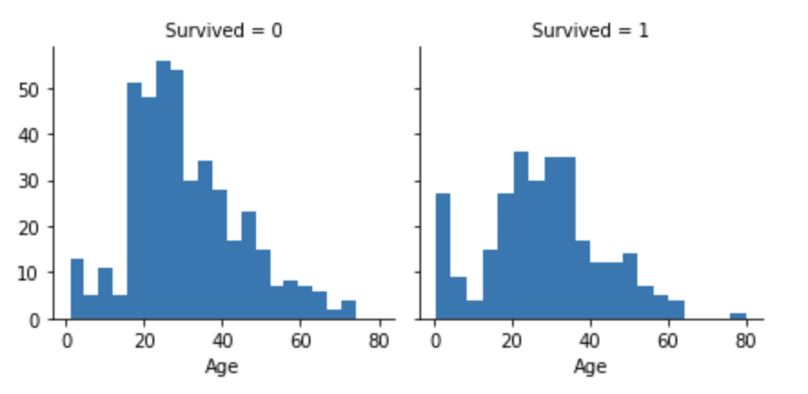0과 1로 이루어진 범주형 변수 'Survived'에 따라 연령대('Age')가 어떤지 히스토그램 그래프로 살펴보겠습니다.