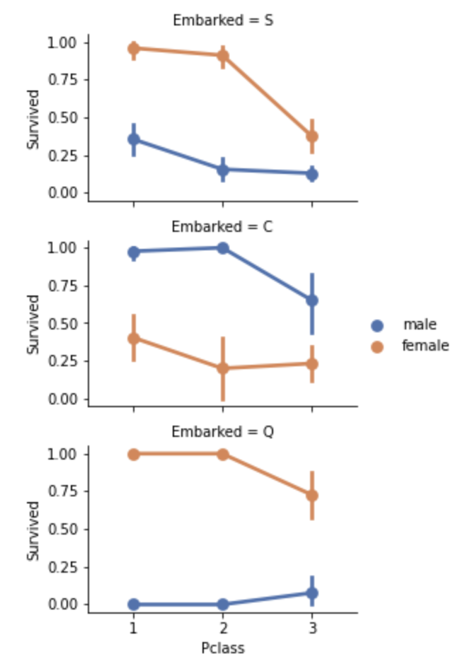 마지막으로 조건을 하나 더 추가해서 탑승항구(Embarked)와 생존여부(Survived)를 행과 열로 나누어 그리는데요,