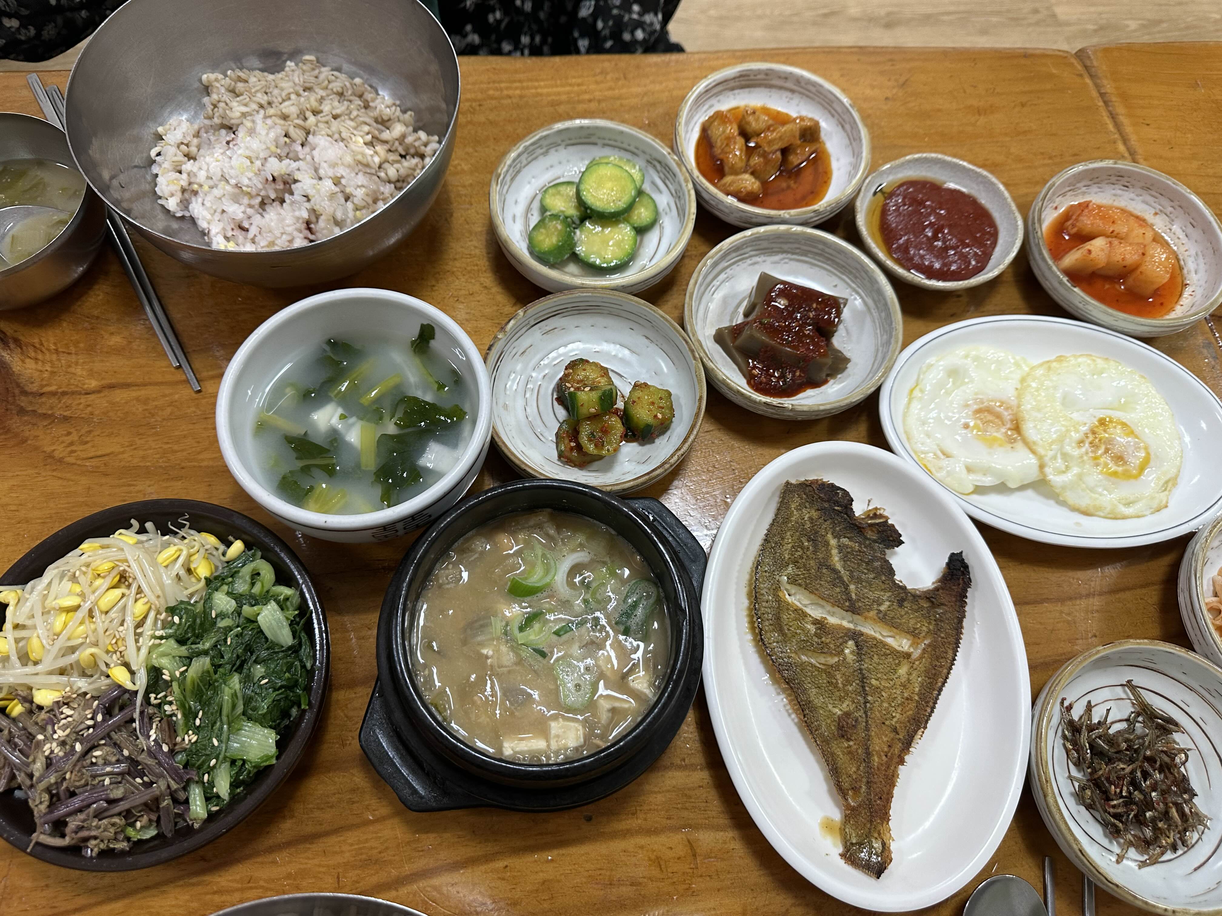 가자미구랑 된장찌개(요거는 좀 짭잘해요. 약간 청국장스타일이어서 보리밥에 비벼먹는 용도같아요)