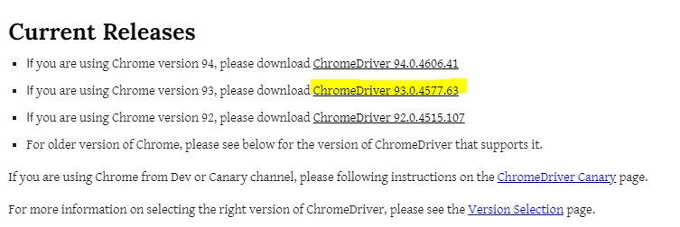 Current Releases If you are using Chrome version 94, please download ChromeDriver 94.0.4606.41 If you are using Chrome version 93, please download ChromeDriver 93.0.4577.63 If you are using Chrome version 92, please download ChromeDriver 92.0.4515.107 For