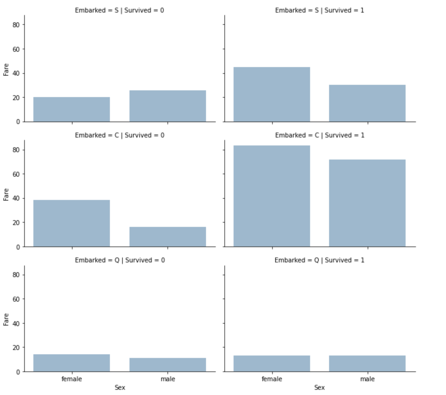 x축은 성별(Sex), y축은 요금(Fare)으로 bar plot을 그려봅니다.