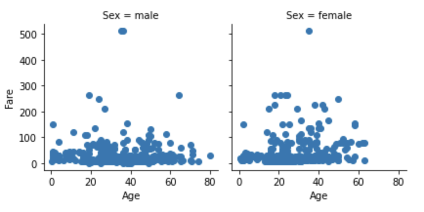 또는, 남자/여자로 이루어진 범주형 변수 'Sex'에 따라 연령별 탑승요금에 대해 산점도로 봐보겠습니다.