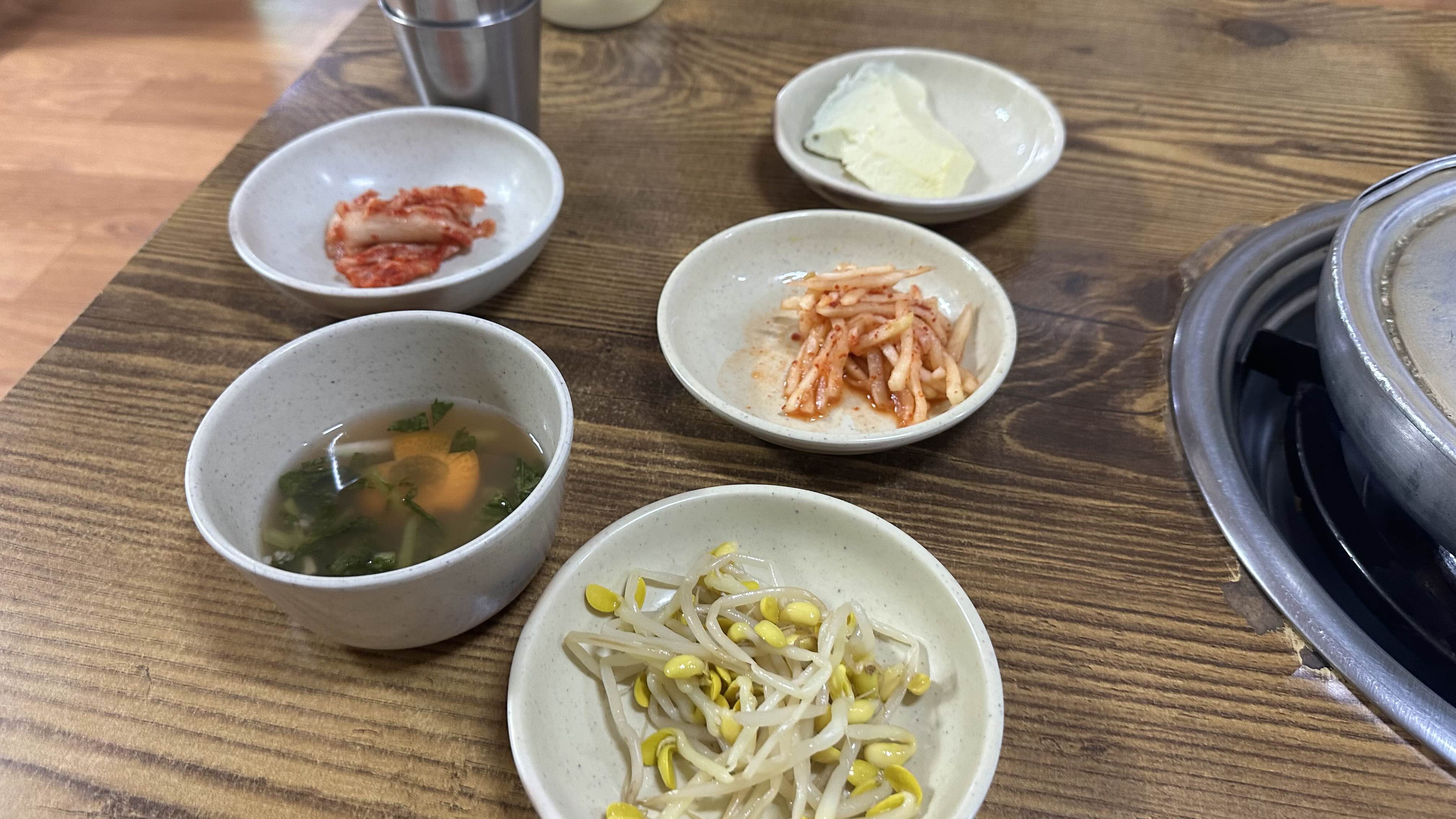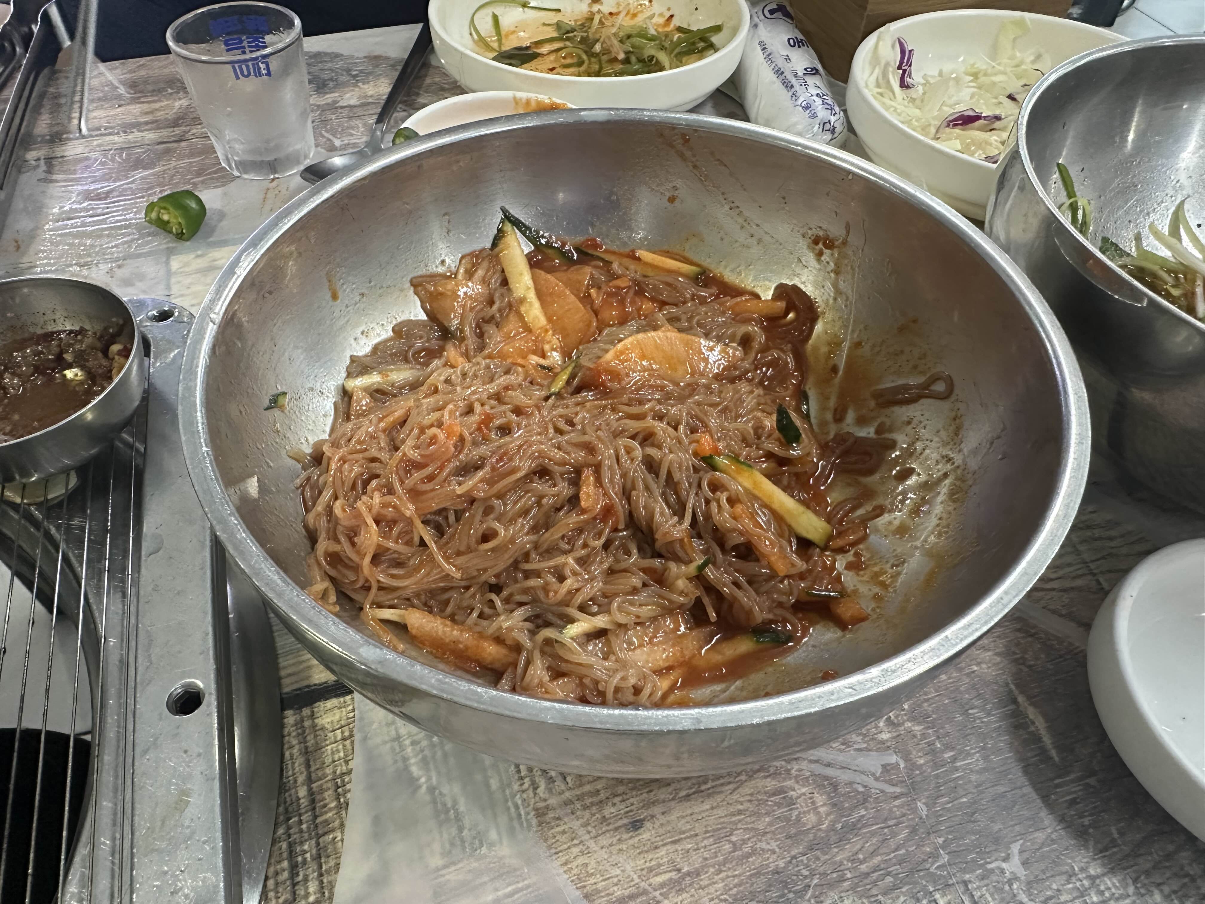 밑반찬으로 나온 무생채나 콩나물을 넣어서 비벼먹음